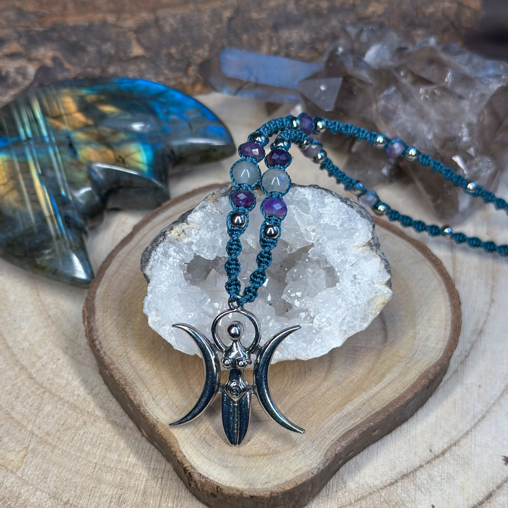 This talisman, hand-knotted from deep turquoise thread, celebrates ancient feminine energy and intuitive wisdom. The Triple Moon Goddess symbol evokes the three main archetypal qualities of womanhood: the fresh, pure vitality of the Maiden, the nurturing abundance of the Mother, and the deep knowledge of the Crone. It serves as a reminder that womanhood is not linear — it is made of cycles, returns, growth, release, and renewal.