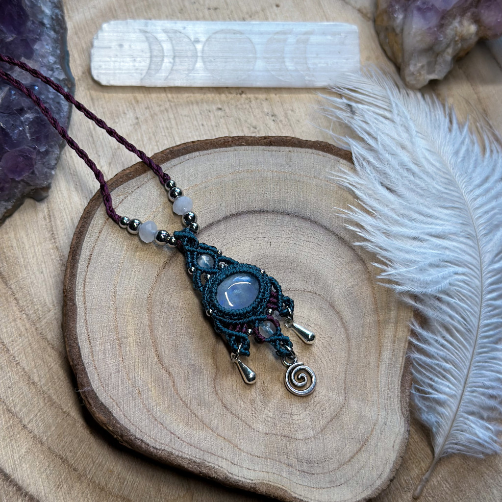 This delicate, handcrafted macramé necklace celebrates the flow of life, the mystical power of change, and the discovery of hidden possibilities. The spiral symbol embodies constant movement, continuous growth, and progress along your inner path. As an ancient motif, the spiral represents returning to oneself, conscious self-reflection, and the mindful integration of experiences, reminding us that every moment contributes to our inner wisdom and personal development. The spiral encourages us to not only focus on the destination but also to pay attention to the journey, the small insights, and the gradual shedding of layers through which true transformation occurs.