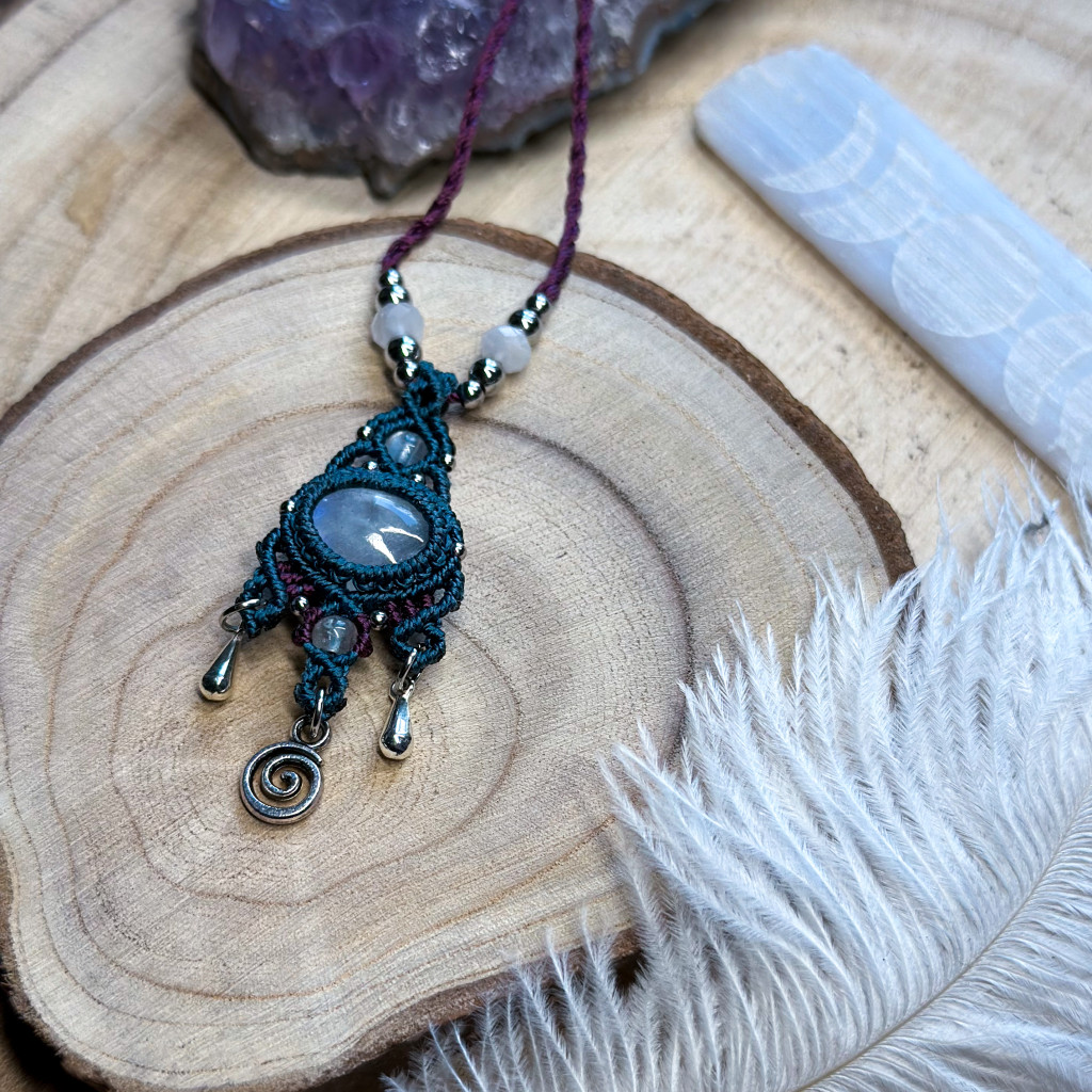 The necklace is adorned with labradorite and moonstone beads, along with delicate metal accents, creating a harmonious blend of mystical elegance.